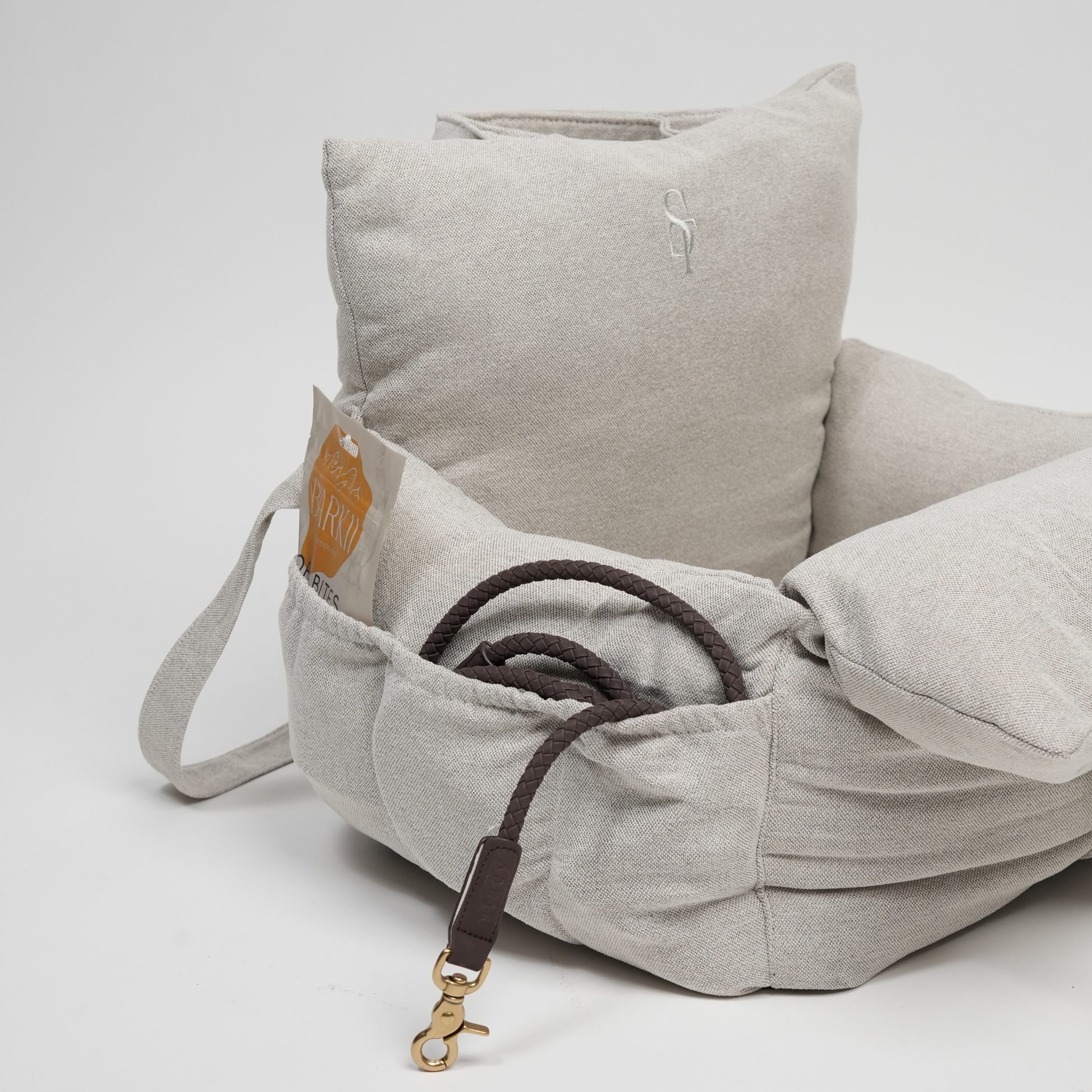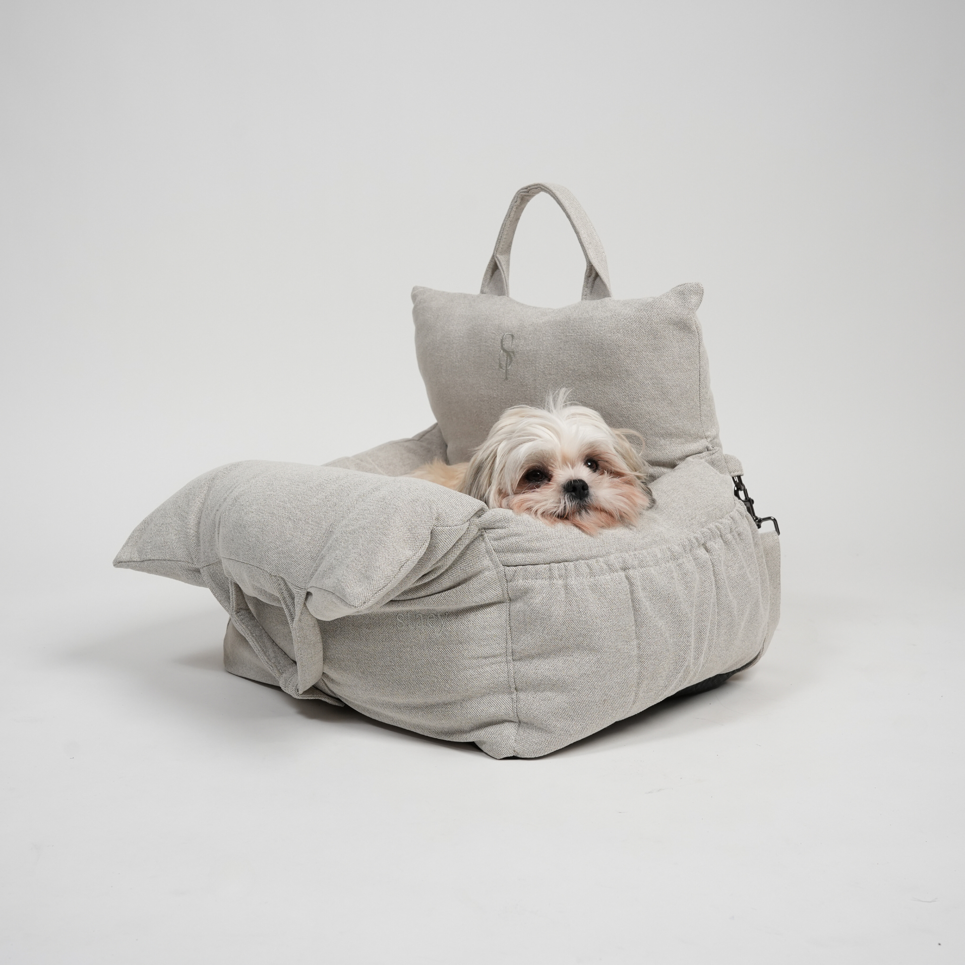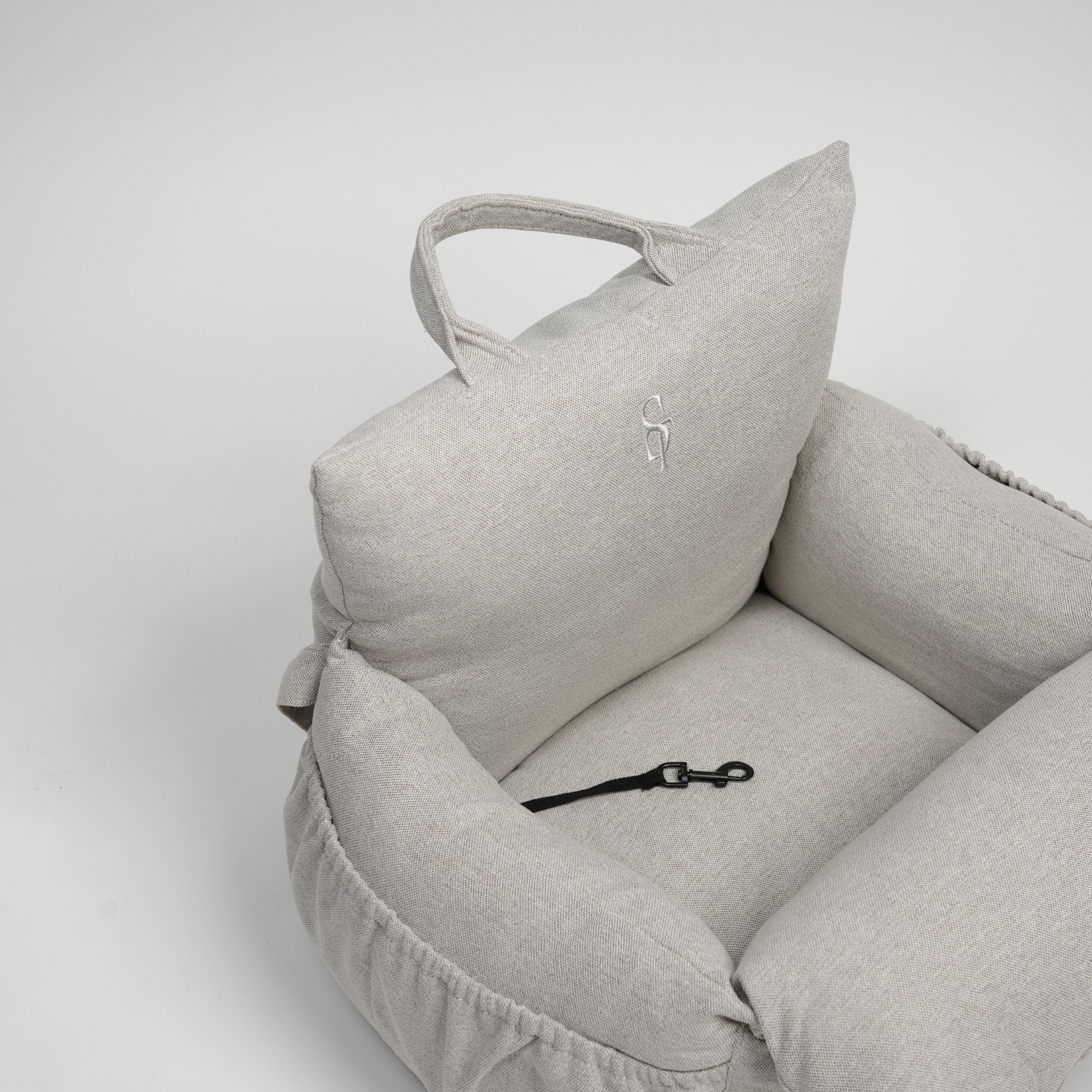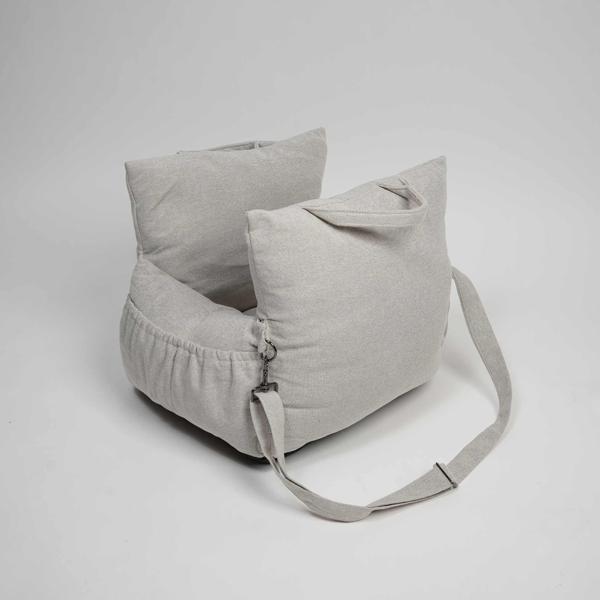 - Sikker Fastgørelse: Med de integrerede spænderemme er det nemt at fastgøre sædet i bilen. Disse remme kan også bruges som en skulderrem, hvilket gør det let at transportere din hund.